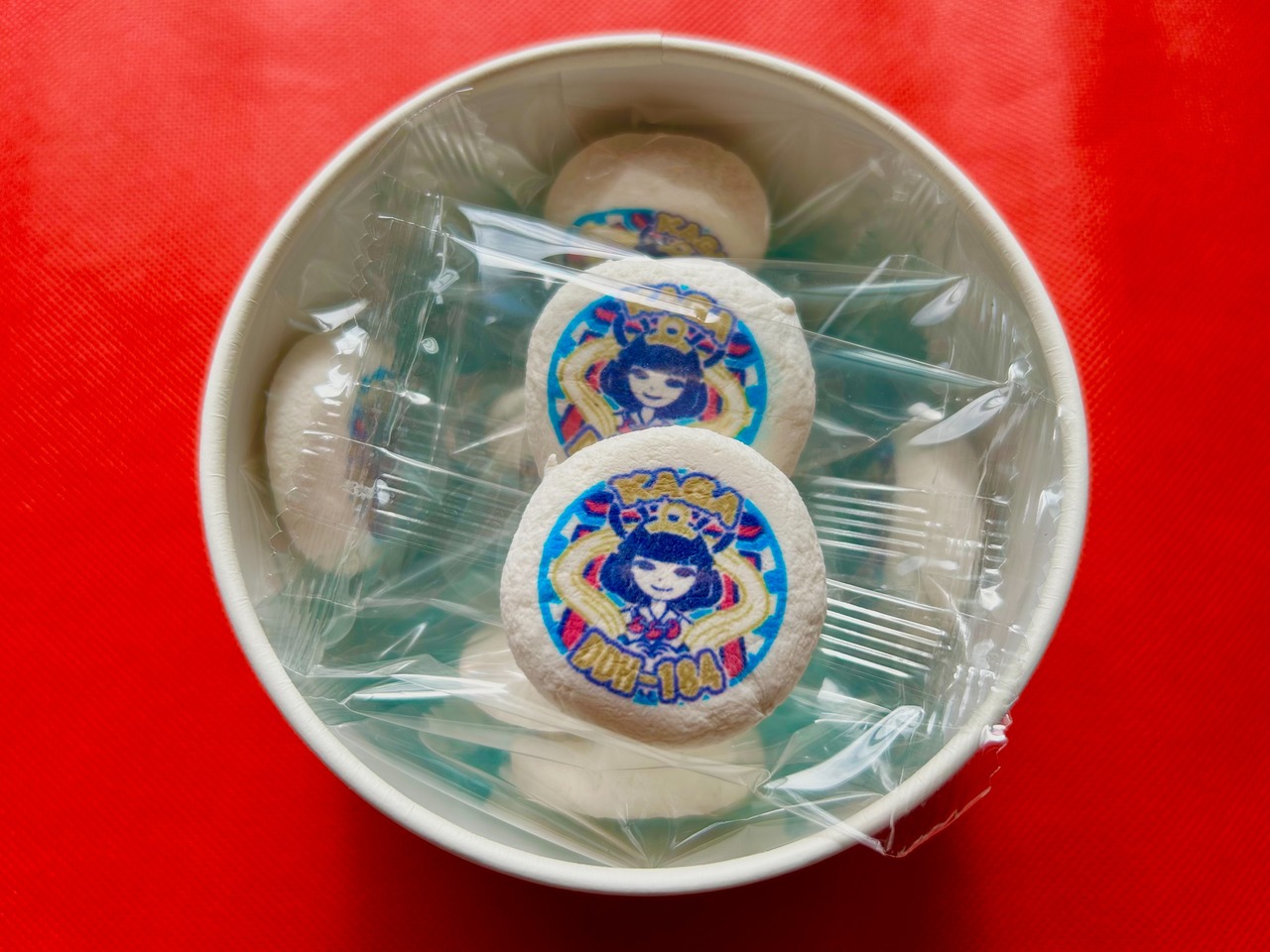 かがちゃんプリントマシュマロは、真っ白い柔らかな表面に、可食インクでプリントを施したマシュマロです。